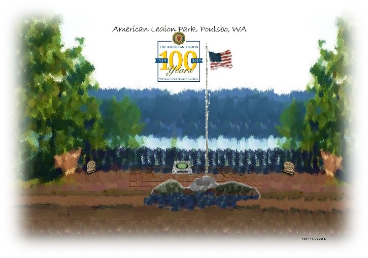 Poulsbo Post 245 passed a major milestone with the completion of the Veterans Plaza in August. The Plaza was built on the site of a former small parking lot above American Legion Park. The land for this park was donated to the American Legion by Selmer Myerboe, a World War I veteran and serves as the city’s waterfront park in downtown Poulsbo The Plaza evolved from a concept drawing to reality in a little two years. In 2017, members of the post debated ideas to celebrate the American Legion Centennial and a plan and design for the plaza was developed. With the endorsement of the mayor and city council, the park moved forward. Funds for construction were raised by the sale of engraved pavers.