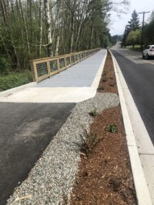 The Finn Hill Road Shared-Use Path project constructed approximately 4,300 feet of ten-foot wide shared-use path with two-foot gravel shoulders on NW Finn Hill Road and Rhododendron Lane NW between Olhava Way NW and Vinland Elementary School in Poulsbo. The path is pervious asphalt and is on the north side of NW Finn Hill Road and the east side of Rhododendron Lane NW. An approximate 400-foot section of path was constructed as an elevated 8-foot wide boardwalk to avoid wetland impacts. Curb ramps, pedestrian crossing signs, and crosswalk markings were installed at the intersections of NW Finn Hill/Urdahl Road and NW Finn Hill Road/NW Rude Road. Approximately 4,200 feet of new curb and gutter on the north side of NW Finn Hill Road and the east side of Rhododendron Lane NW were installed between the travel lane and the landscape buffer/boardwalk/multi-use path. Streetlights were mounted on existing utility poles at pedestrian crossing locations. This project was completed in July 2021.