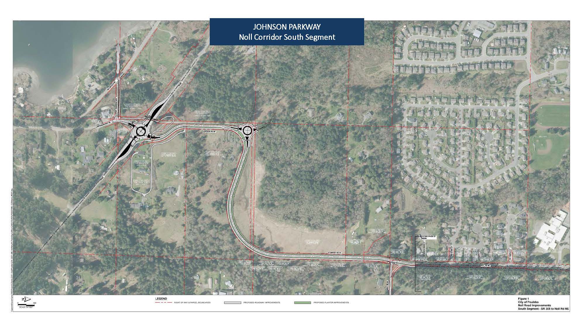 When completed, this project will connect SR305 to NE Lincoln Road via Noll Road, Langaunet Lane and Maranatha Lane. The project will include street lighting, sidewalks, and shared-use path improvements throughout the corridor. The construction of a roundabout was completed at the new intersection of SR305/Johnson Road in the summer of 2023, along with a non-motorized tunnel crossing at SR305, and realignment of the south segment of Noll Road to the new roundabout/SR305 intersection. Please visit the Johnson Parkway project page for more information on the new roundabout HERE.
