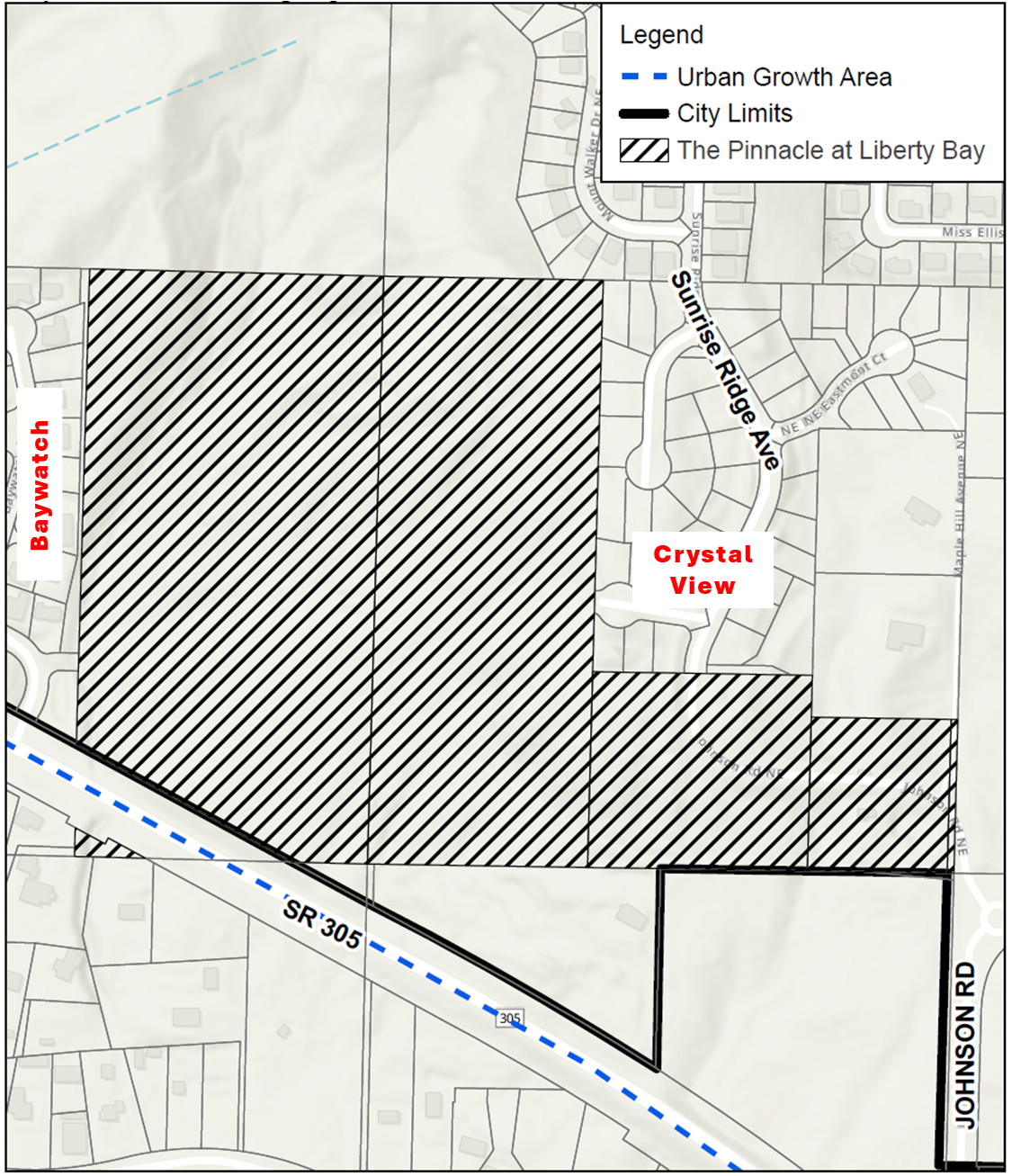 Pinnacle at Liberty Bay is a proposed Subdivision and Planned Residential Development (PRD) located on approximately 42 acres in the Residential Low (RL) zone of Poulsbo. The site is situated between the existing Crystal View and Baywatch neighborhoods. Physical characteristics of the property include a mix of gentle to steep slopes, second- and third-growth forest consistent with historical logging activity, several wetlands, and three stream segments or drainages. The proposal includes 151 single-family residential lots, along with associated infrastructure such as internal roads, open space, stormwater management facilities, and preservation of critical areas and required buffers. Vehicular access is proposed via two points on State Route 305: Baywatch Court NE on the west and Johnson Parkway NE on the east. The development also proposes to complete a segment of Sunrise Ridge Avenue NE, connecting to the Johnson Parkway NE roundabout, which would establish a continuous east-west connection and improve access for public and emergency services in the area.