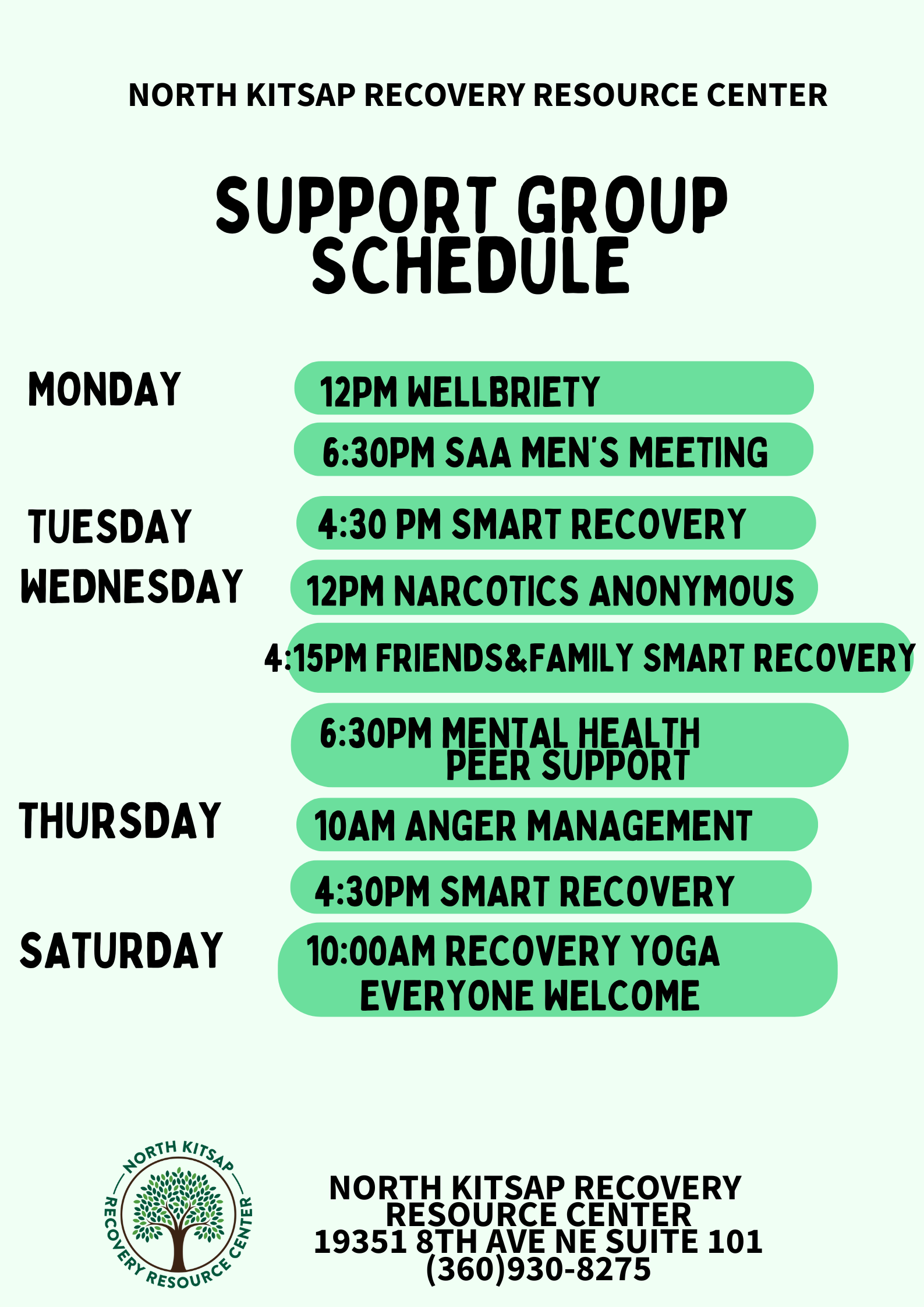The North Kitsap Recovery Resource Center is a walk-in, no-cost resource center for anyone interested in drug or alcohol recovery in the North Kitsap area. The Center is open for walk-in services Monday – Friday from 10am to 4pm. The main phone line is (360) 930-8275 and Center Manager Kari can be reached at (360) 564-9635.